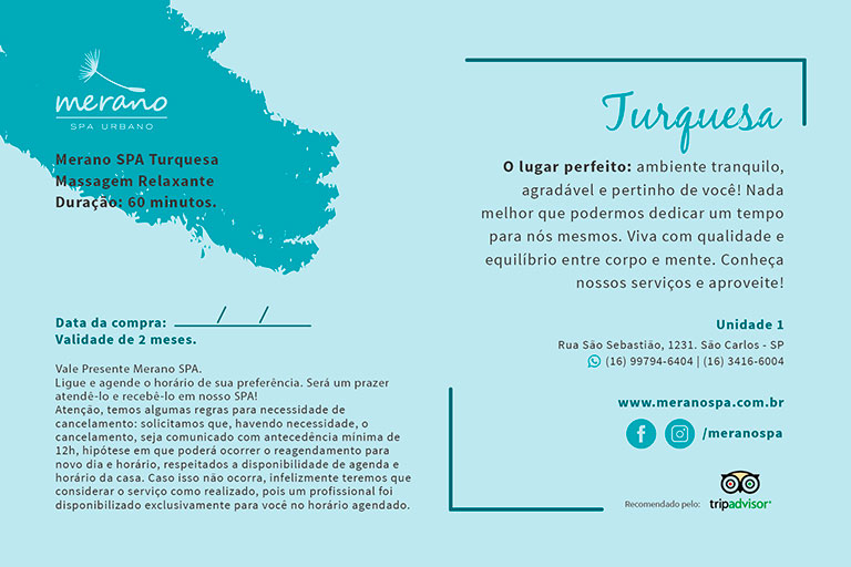 O Gift Card Turquesa é composto por uma massagem relaxante maravilhosa, realizada por profissionais capacitadas e com excelência em atendimento Merano SPA!
